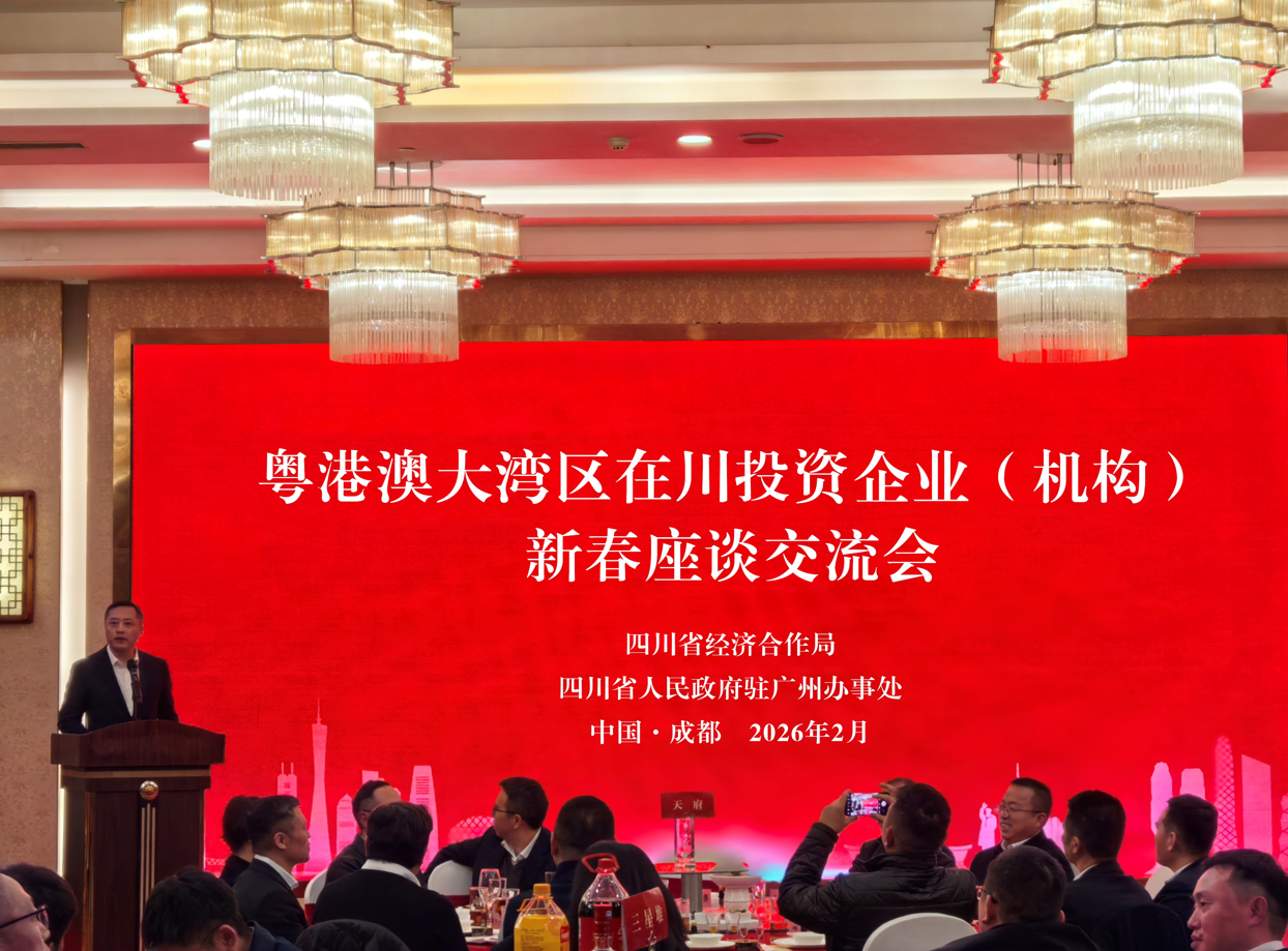 2月4日,由四川省经济合作局、四川省政府驻广州办事处共同主办的2026年粤港澳大湾区在川投资企业(机构)新春座谈交流会在成都举办。活动以深化川粤区域协同、共探发展新机遇为核心,汇聚政企各界代表,共商合作、共谋发展。南方航空、中国旅游集团、华侨城、紫荆文化、中国平安、腾讯、广药、云从科技、中科云图、华大基因等60家央企、“三类500强”企业、行业领军企业及商(协)会代表参会。